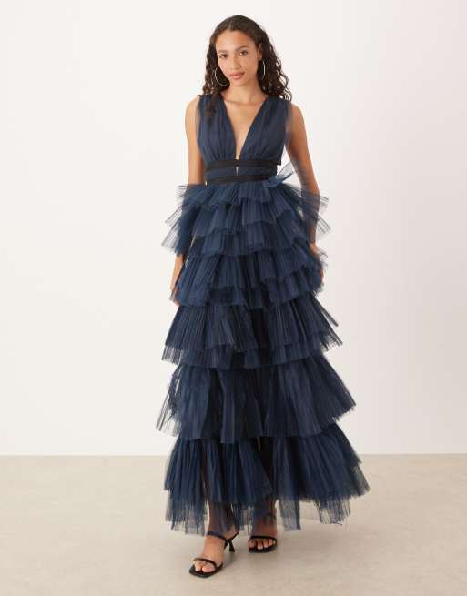 True Decadence Plunging neck layered tulle maxi dress in dark navy