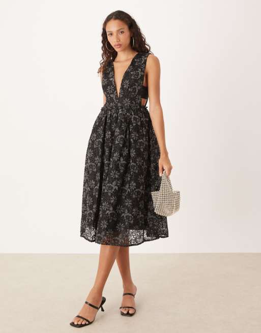 True Decadence Plunging neckline skater midi dress in black