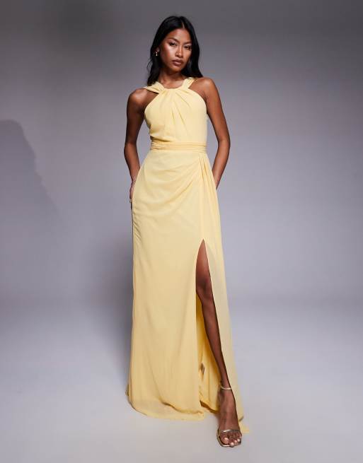 Goddiva Halterneck thigh split chiffon maxi dress in lemon