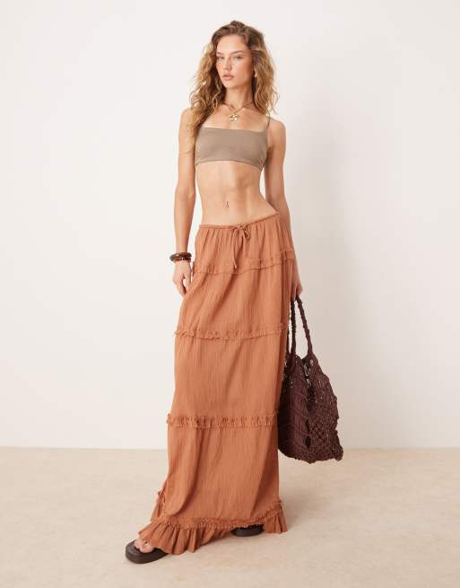 ASOS DESIGN crinkle ruffle maxi beach skirt in tobacco brown