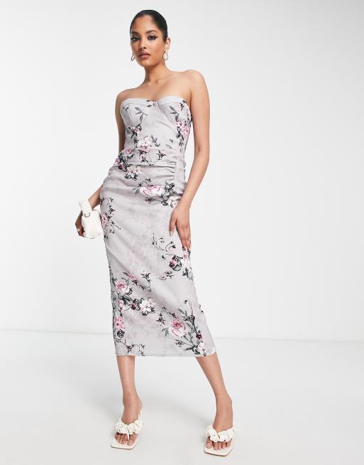 True Violet corset bandeau midi dress in silver and pink floral print