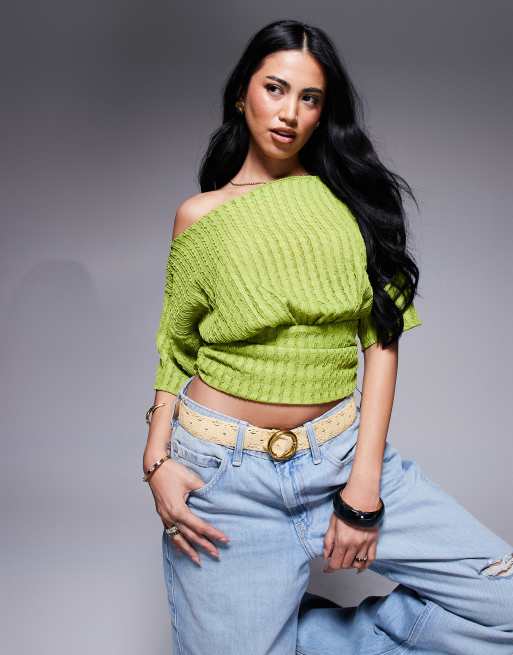 ASOS DESIGN asymmetric one shoulder short sleeve texture top with cinch waist detail in green