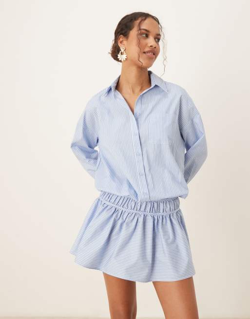 ASOS DESIGN blouson shirt mini dress with dropped waist in blue and white stripe
