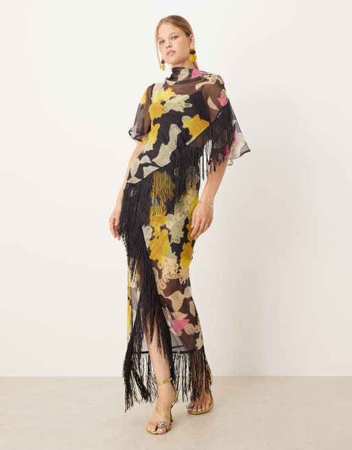 ASOS DESIGN chiffon fringe detail maxi dress in dark based print