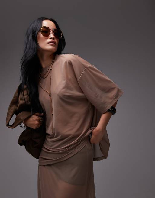ASOS DESIGN mesh oversized longline t shirt in stone
