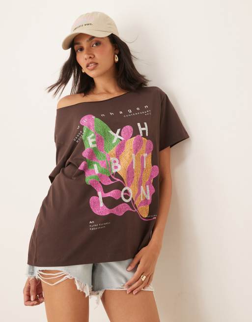 ASOS DESIGN off shoulder t-shirt with exhibition graphic in brown