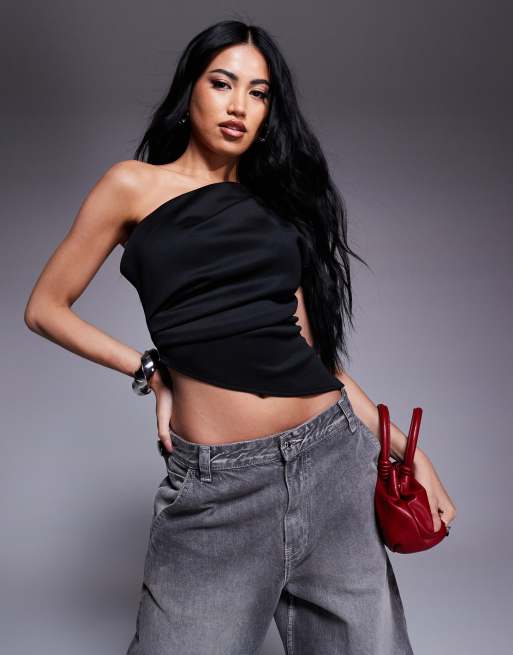 ASOS DESIGN one shoulder asymmetric crepe hem top with ruching in black