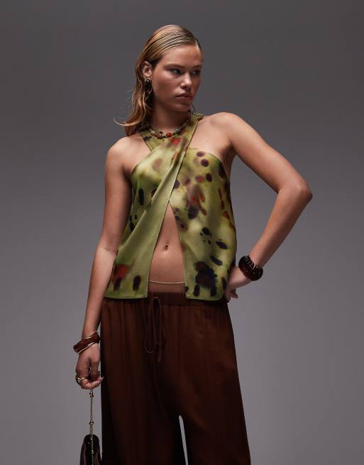 ASOS DESIGN satin wrap front halter top in green tie dye print