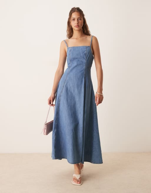 ASOS DESIGN soft denim cami fit and flare midi dress in midwash blue