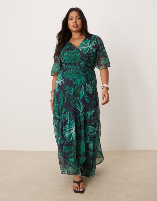 Hope & Ivy Plus flutter sleeve maxi wrap dress in turquoise palm print