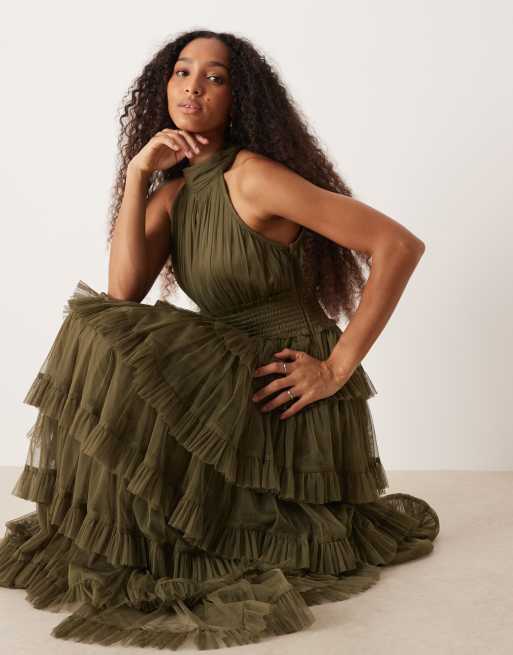 Lace & Beads high neck tiered tulle maxi dress in olive