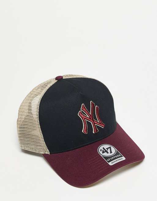 47 Brand NY Yankees offside trucker cap with contrast peak detail in burgundy multi