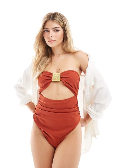 4th & Reckless bandeau gold hardware cutout detail swimsuit in coral