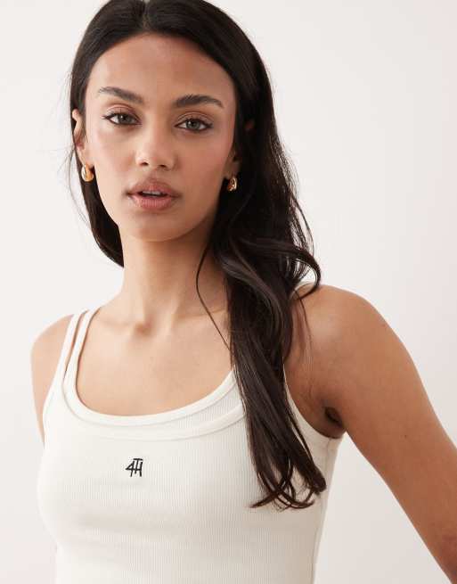 4th & Reckless cotton rich double layered embroidered logo cami top in white