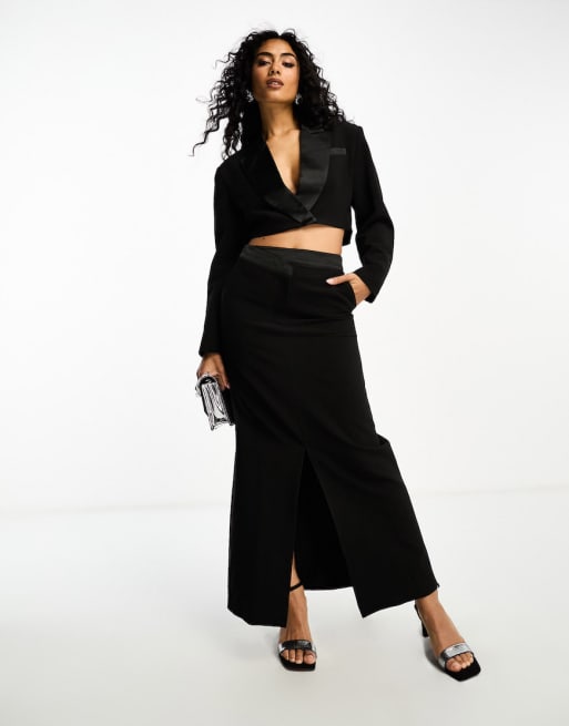 4th & Reckless satin lapel cropped blazer and maxi skirt co-ord in black