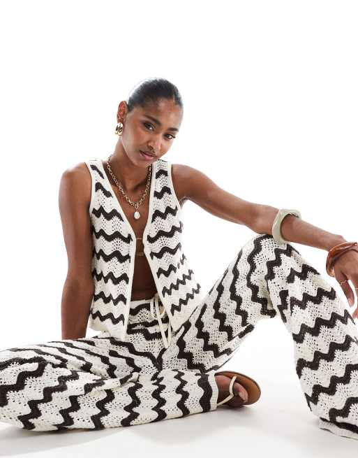 4th & Reckless split front ring detail crochet beach top co-ord in chocolate and cream wave