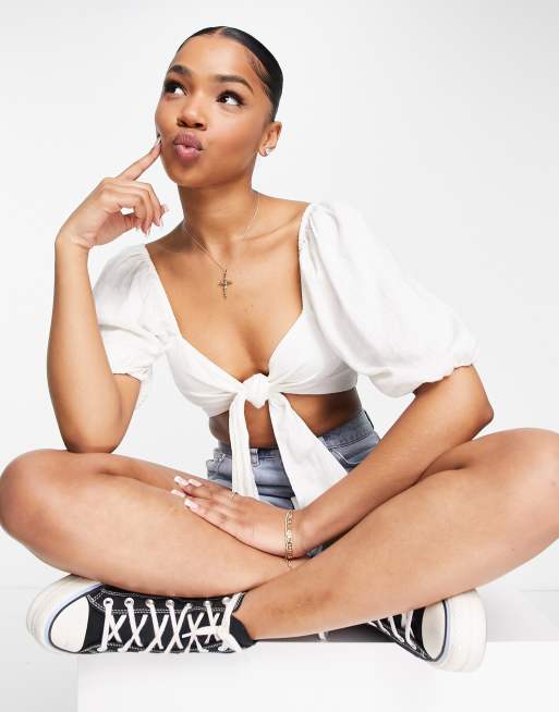 Abercrombie & Fitch co-ord tie front linen puff sleeve top in white