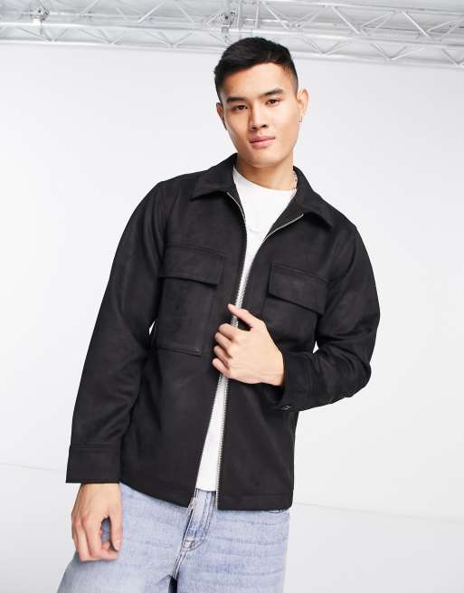 Abercrombie & Fitch faux suede zip front shirt jacket in black