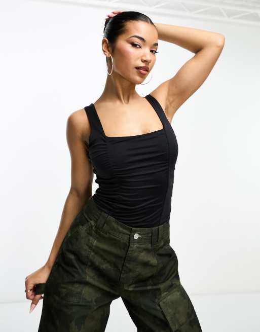 Abercrombie & Fitch square neck ruched bodysuit in black
