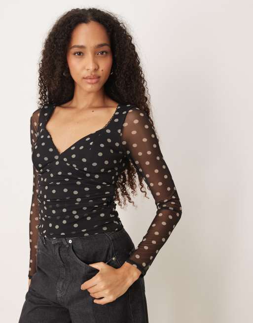 Abercrombie & Fitch sweetheart neckline long sleeve top in black polka dot