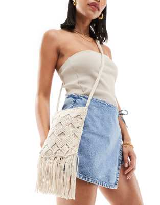Accessorize crochet phone bag with tassles in cream