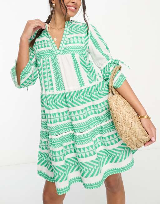 Accessorize flute sleeve jacquard beach summer mini dress in green & white