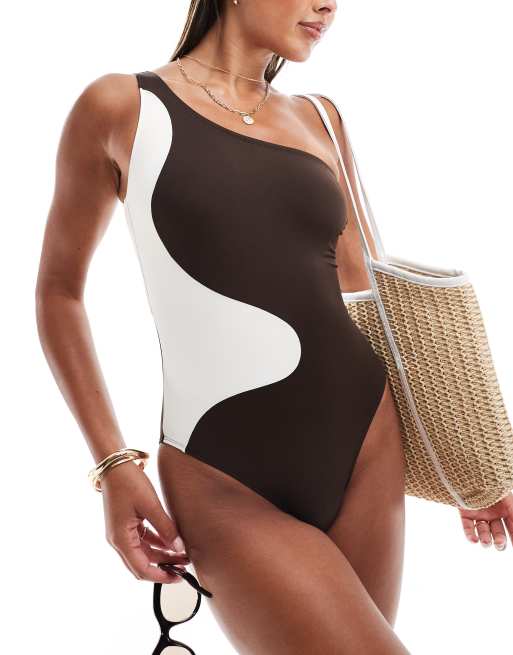 Accessorize monochrome swirl one shoulder swimsuit in brown and cream