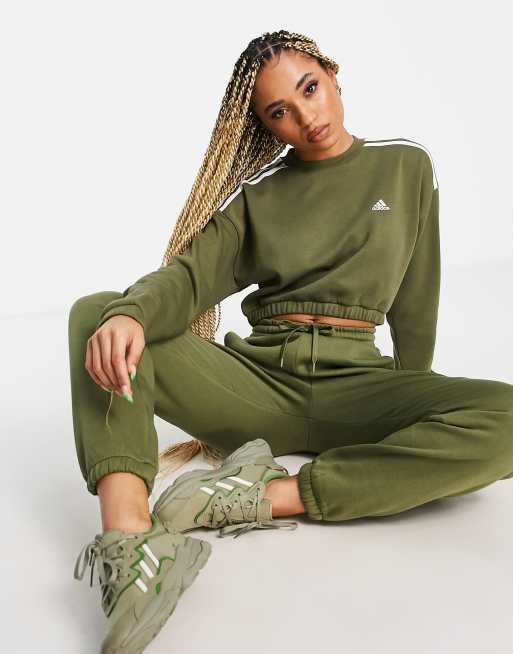 adidas Training cropped sweatshirt with three stripe in khaki