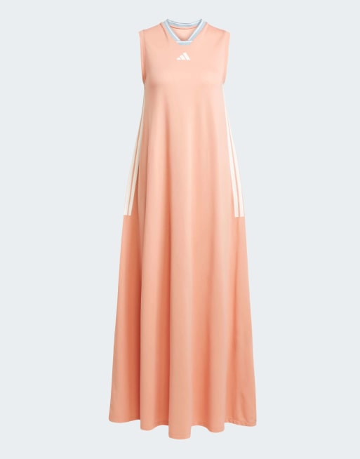 adidas Tiro cut 3-stripes soft mesh long dress in ambient blush / white