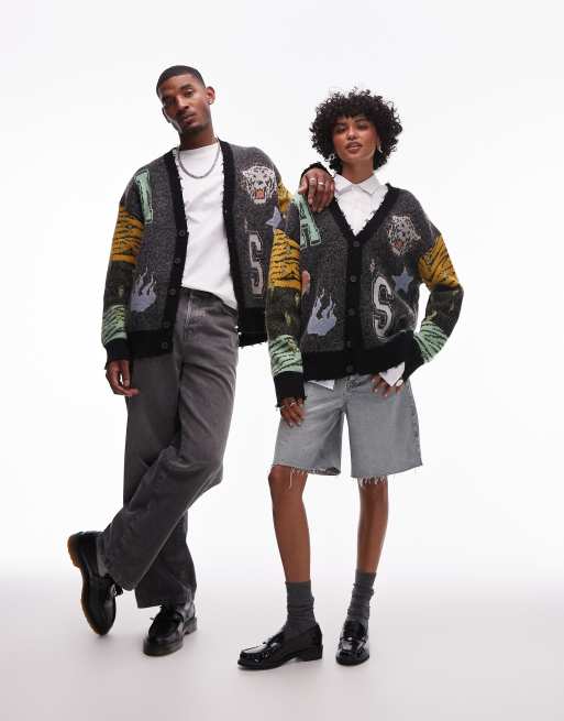 AllSaints Akki unisex collegiate graphic cardigan in grey