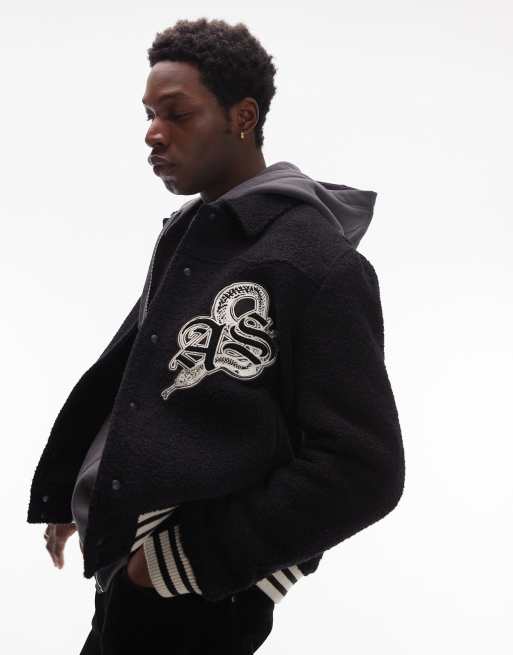 AllSaints Ambaum graphic patch bomber jacket in black