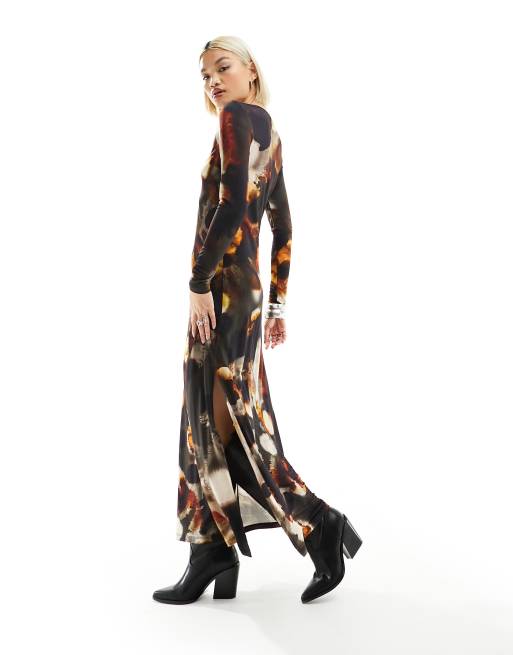 AllSaints Katlyn Mars long sleeve printed maxi dress in rust brown