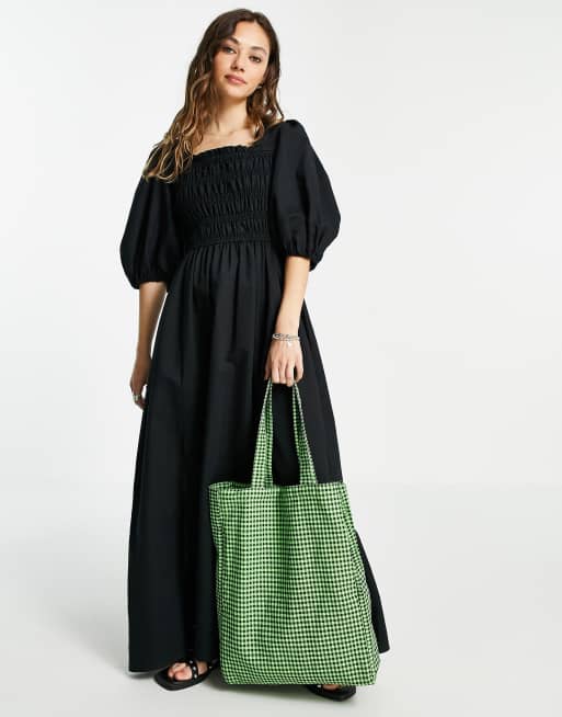 AllSaints Livi lenen puff sleeve maxi dress in black