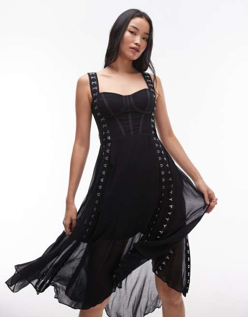 AllSaints Luna corset mesh midi dress in black