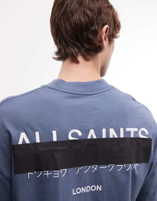 AllSaints Redact oversized embroidered logo t-shirt with back print in mid blue