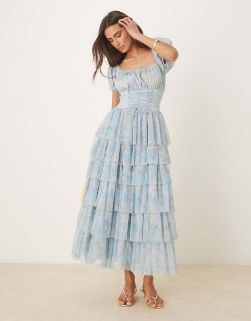 Amy Jane London Arabella corset waist tiered maxi dress in blue rose