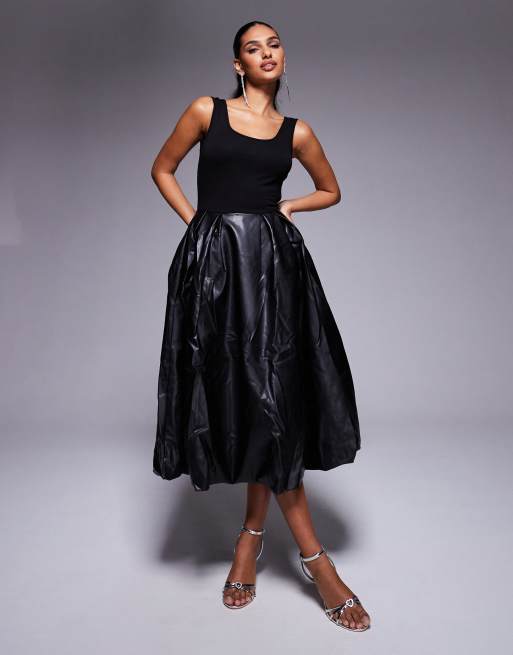 Amy Lynn Alexa scoop back puffball midi dress with PU skirt in black