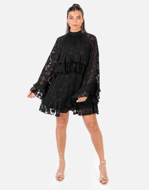 Anaya Floral burnout high neck ruffle sleeve shift mini dress in black