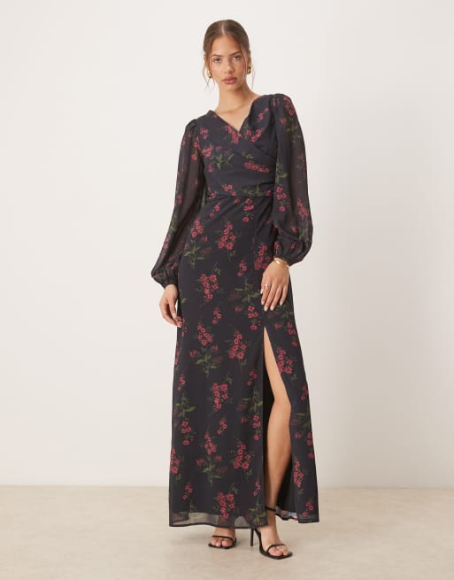Anaya Floral faux wrap long sleeve maxi dress in black