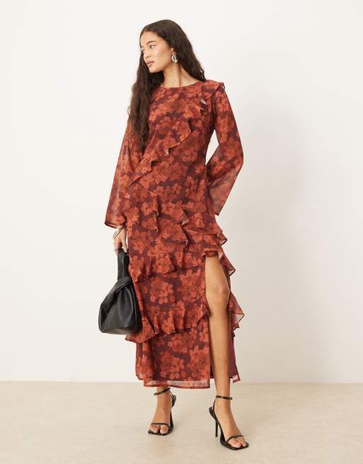 Anaya Floral long sleeve ruffle midaxi dress in rust