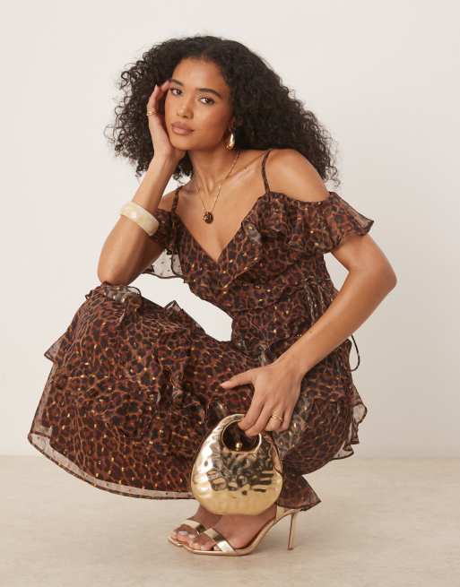Anaya leopard print wrap cold shoulder top in brown - BROWN
