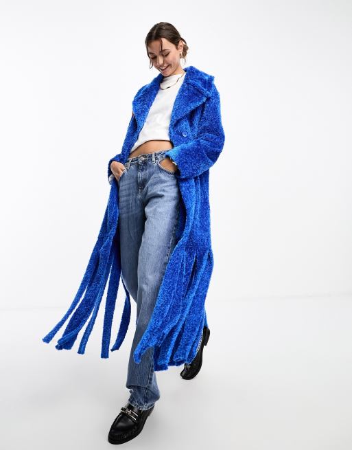 Annorlunda fluffy oversized curved collar tassel edge coat in cobalt blue