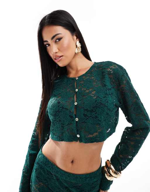Aria Cove exclusive lace button through long sleeve top co-ord in emerald green