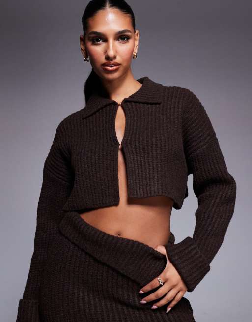 Aria Cove knitted wide rib collared clasp front cardigan co-ord in chocolate