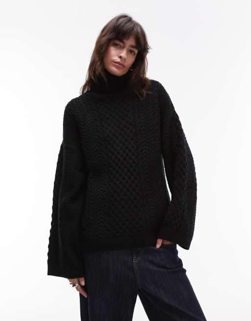 ARKET cable knit sweater in decorative pattern with high neck in black