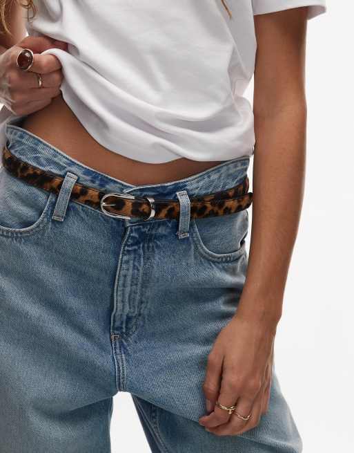 ARKET leather hairy thin belt with gold buckle in brown leo print
