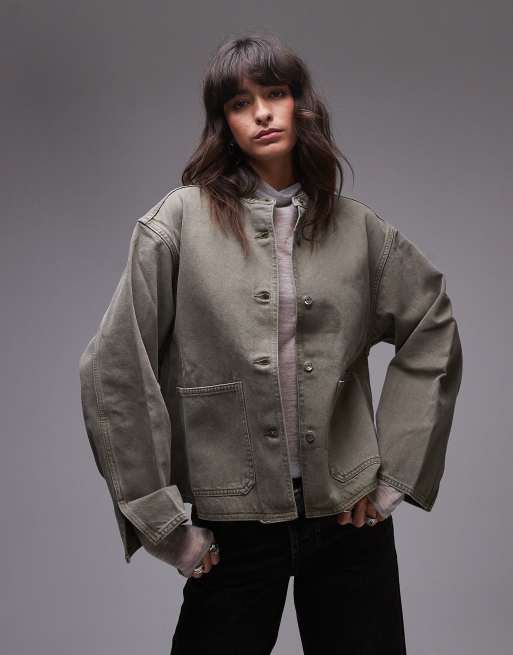 ARKET oversized denim shacket with high collar and front patch pockets in washed khaki green