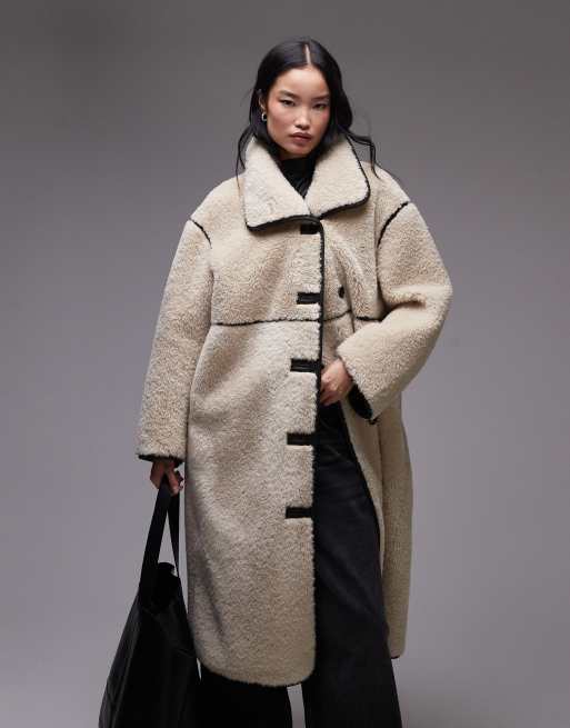 ARKET oversized faux shearling midi coat with brown contrast edging in light beige