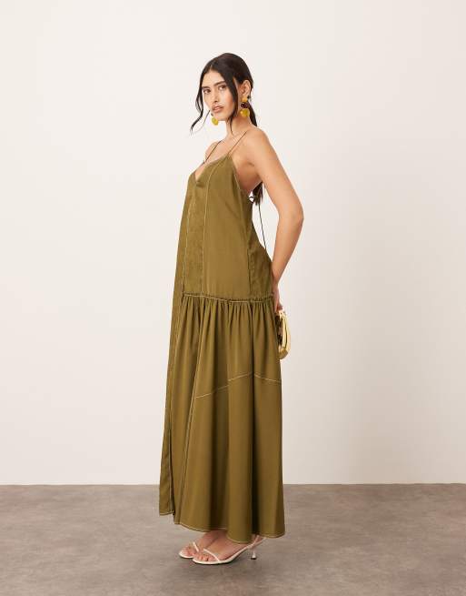 ARRANGE crinkle satin mix cami midi dress with raw edging in olive green