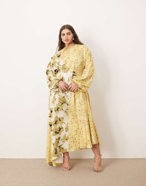 ARRANGE Curve crinkle satin long sleeve midi dress with trim in colourblock floral print